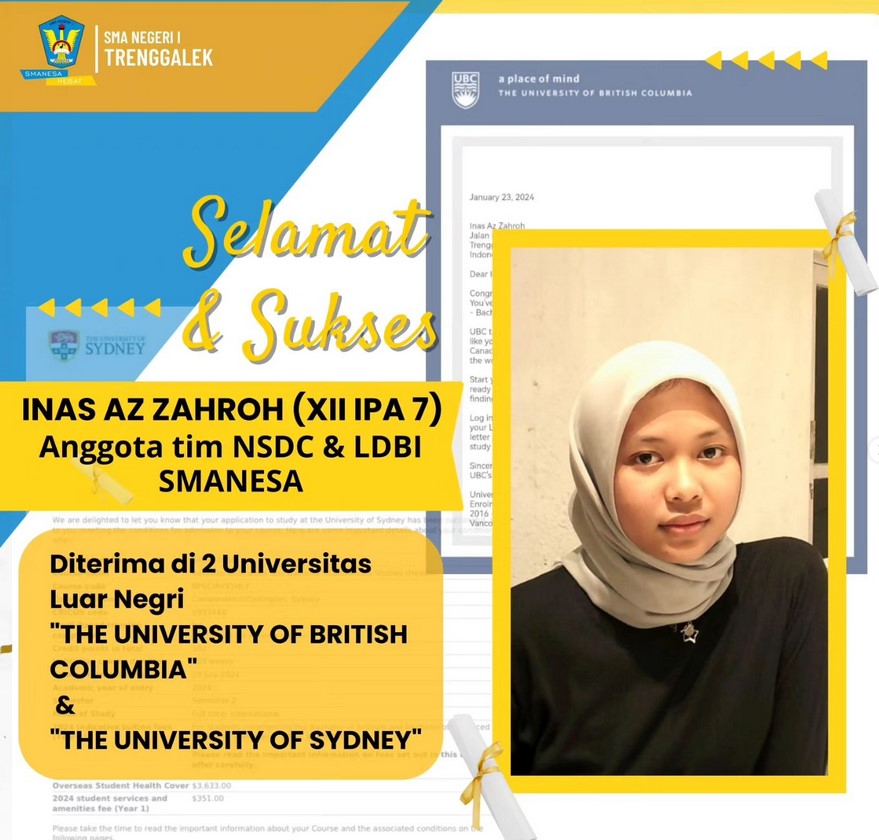 Inas Az Zahroh, peserta didik SMA Negeri 1 Trenggalek yang saat ini di kelas XII MIPA 7 membawa berita bahagia yang membanggakan seluruh civitas akademika SMA Negeri 1 Trenggalek.